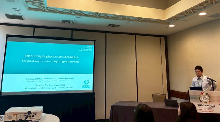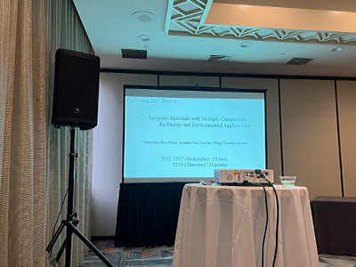 12月17日の午前9:30~9:50(現地時間)にSession S20-Advanced Functional Materials for Clean Energy Solutionsで「Effect of hydrophobization in Zr-MOFs for photosynthesis of hydrogen peroxide」というタイトルで口頭発表を行った(図3)。