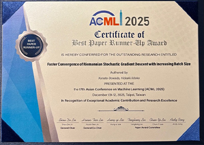 ACML 2025において、貴財団から国際交流助成をいただいた本論文「Faster Convergence of Riemannian Stochastic Gradient Descent with Increasing Batch Size」が「Best Paper Runner-up Award」を受賞いたしました。ACML 2025に投稿された375本の論文の内107本の論文が採択され(28.5%)、査読得点4点中3.75点以上を獲得した上位9本の論文から、審査委員会の厳正な審査の末、「Best Paper Award」(1件)と「Best Paper Runner-up Award」(1件)が選出されました。