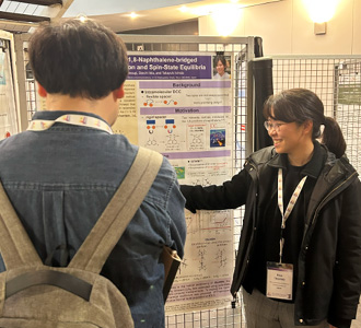 2件目の発表題目は、「構造異性体がスピンクロスオーバー(SCO)挙動に影響する要因解明に向けた新たな洞察の提案」である。SCO は外部刺激によってスピン状態が可逆的に変化する現象である。本発表では、分子間相互作用の定量に用いられる Hirshfeld 解析を SCO 転移温度の予測に応用する手法を紹介した。また、キラル配位子を用いた錯体に着目して研究を進めた点も特徴である。今回の学会では、キラリティ導入が磁気特性に与える影響が全体的に注目されており、キラリティによる結晶パッキング変化や磁気応答への影響について多くの有益な議論を行うことができた。これらの議論から得られた意見は、今後の論文執筆に大いに役立つものであった。