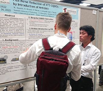 ポスターセッションの2時間の間、ほぼ切れ目なく見学者が訪れ、説明の要望や質問を多数受けた。特に、実際に高温超伝導SQUIDセンサを使用している研究者は高い関心を持っており、複数の研究所のメンバーと詳しい内容や課題についての議論を交わした。一方で、近年の希ガスイオンビーム照射による高温超伝導薄膜加工の発端であるShane A. Cybart氏も訪れ、本研究で使用しているガリウムイオンビームを使用して加工したデバイスの長期安定性に関する問題点について指摘し、改めて今後の課題であると感じた。また、デバイス開発ではなく、人工ピンニングサイトであるアンチドットを応用していることから、超伝導線材を開発している研究者も多く訪れた。線材の研究者の知見から見た解釈は、アンチドットの物理的な特性に踏み込んだものであり、参考になった。今後は、今回の学会参加で得られた知見を活かし、現在の高温超伝導バイクリスタルSQUIDのアンチドットによる磁束ノイズ低減をより詳細に検証していく。