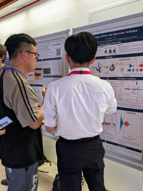 「Scalar-Mode OPMs with Spin-Echo Technique」という題目でポスター発表を行った。OPMはアルカリ金属原子とレーザ光を用いた超高感度量子磁気センサであり、アルカリ金属原子の密度やレーザ光の入射方向などにより様々な動作モードが存在する。その中でも我々は磁気シールドなしで磁場計測可能なスカラ型OPMに着目しスピンを再収束させるπパルスを導入したスピンエコーシーケンスを提案した。本提案手法では、FID信号後にπパルスを印加し、位相が乱れたスピンを反転させてスピンを再収束させることで、エコー信号を発生させ、磁場不均一の影響を補正する。従来の方法では磁場の空間的不均一性によりFID信号が急速に減衰する条件でも、本手法ではその後に観測されるエコー信号により磁場の推定ができるようになる。本手法の有効性の調査に関して実験とシミュレーションによる数値検討の両方を行った。