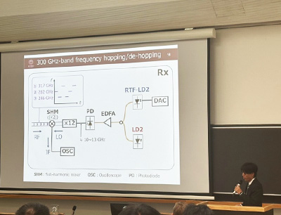 私は「Experimental Demonstration of High-Speed Wavelength-Tunable-Laser-Enabled Frequency Hopping/De-Hopping for Secure 300-GHz band Wireless Communication」という題目で口頭発表を行いました。本研究では、高セキュリティな次世代無線通信の実現を目指し、テラヘルツ帯における周波数ホッピングスペクトラム拡散(FHSS)およびデホッピング(ホッピング信号の復元)システムを実現しました。近年、無線通信需要が急激に増加しており、現在広く使用されている電磁波よりも広帯域で大容量化が可能な無線キャリアとしてテラヘルツ波の活用が注目されています。一方で、テラヘルツ波無線通信におけるセキュリティの確保は喫緊の課題であり、その対策の一つとしてFHSSの適用が期待されています。FHSSは、送信側で通信中の周波数帯を高速に切り替え、受信側では事前に共有されたホッピングパターンに基づいて信号を復元する技術です。不正な第三者がホッピングパターンを知らなければ傍受や妨害は困難であり、高いセキュリティ性が得られます。ただしFHSSの実用化には、受信側でのローカルオシレータの同期が必要となります。これは超高速サンプリングが可能なA/Dコンバータによって実現可能ですが、受信機の実装コストや消費電力が大幅に増加し、これまでリアルタイムでのデホッピングは実用面で大きな課題となっていました。本研究では、高速波長可変レーザを用いて、テラヘルツ波FHSSにおけるナノ秒オーダーの周波数遷移を実現し、遷移中の非通信時間を大幅に短縮することで通信効率の向上を達成しました。さらに、このフォトニクスベースのシステムを応用することで、受信側におけるリアルタイムなデホッピングの実現可能性を示しました。
