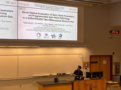 EDISON 23では、「Novel Optical Evaluation of Spin–Orbit Parameters via Programmable Spin Helix Patterning in a GaAs/AlGaAs Two–Dimensional Electron Gas」という題目で口頭発表を行った。空間光変調器を用いて任意周期のスピンヘリックスを直接生成し、その時間発展を測定することで、スピンヘリックスの波数依存の緩和時間からRashbaおよびDresselhausスピン軌道相互作用を理論整合的に抽出する新手法を提示した。従来法に比べ、波数空間からの評価で柔軟性と整合性が高く、デバイス設計指標への直結可能性が討論の焦点となった。