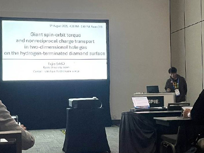 今回私の講演題目は、“Giant spin-orbit torque and nonreciprocal charge transport in two-dimensional hole gas on the hydrogen-terminated diamond surface”であり、水素終端ダイヤモンドという材料の電流スピン流変換効率と、電流誘起スピン偏極がもたらす電気伝導特性について議論しました。