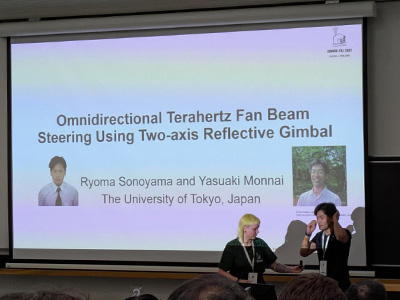 12分の口頭発表に続く3分間の討論では、Adelaide大学のWithawat教授から、(1) なぜファンビームなのか、ペンシルビームでは不十分なのか、(2) 円偏波化は3Dプリンタを用いてより簡便に実現できるのではないか、という質問を受けた。いずれも本質を突いた指摘であり、特に(2)については講演後に個別で議論し、参考となる先行研究を紹介していただいた。
